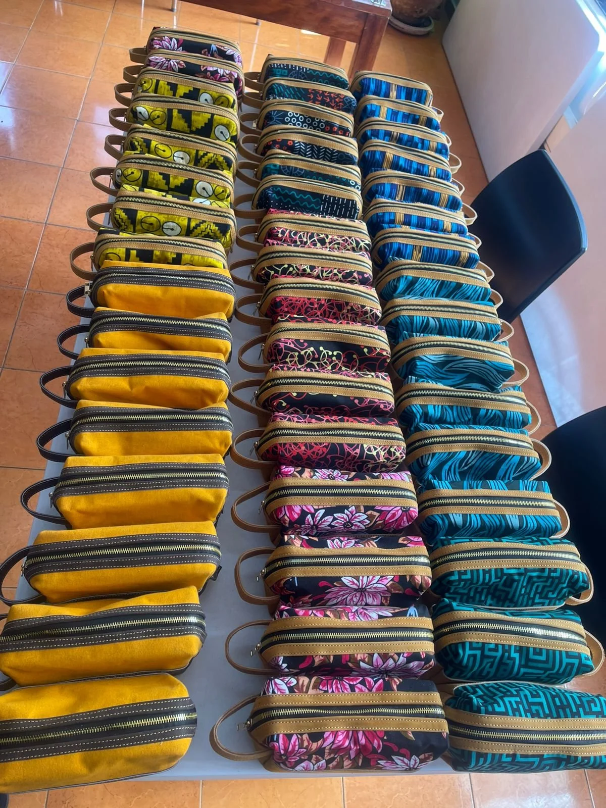 This Ankara & leather bag, which comes in a variety of patterns, is perfect for travel, toiletries, work supplies, and everyday essentials.